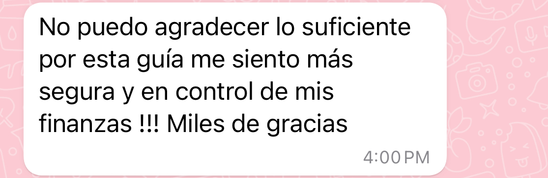 Después de 5 años aplicando toda la informacion adquirida de finanzas personales puedo decirte que esta te cambiara la vida para siempre. Y es por eso que hoy mi mision es ayudar a todas las mujeres que desean cambiar sus vidas financieras para siempre , empoderarse , conseguir su libertad financiera y vivir finalmente con cero preocupaciones y en total paz mental.